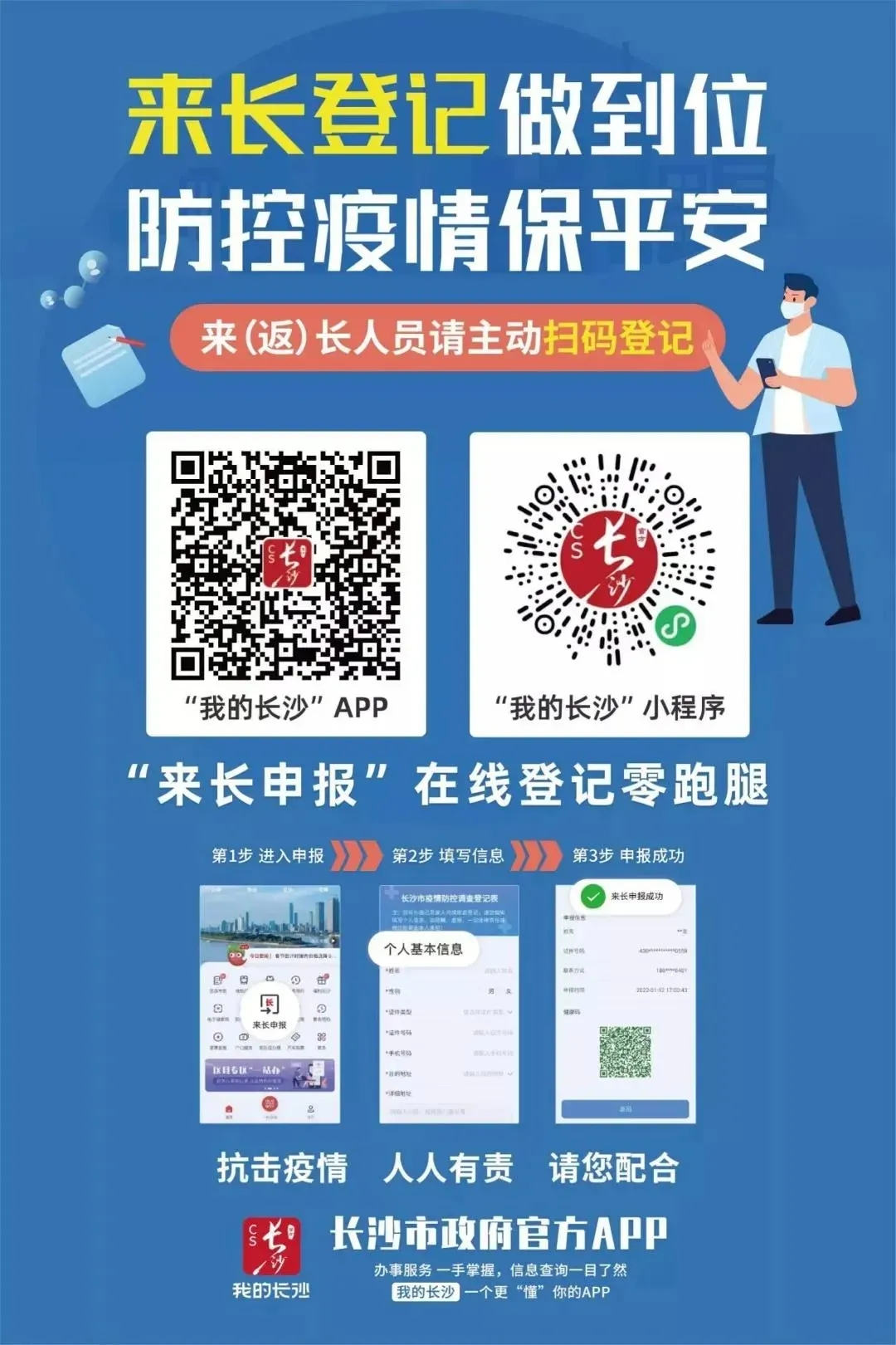 一、主动报备行程请符合以下任意一种情形的来(返)长人员,通过“我的长沙”app或“我的长沙”小程序报备,也可选择通过电话、委托亲人朋友同事等方式向目的地所在社区(村)、工作单位或所住酒店报备,按要求配合做好各项防控工作。