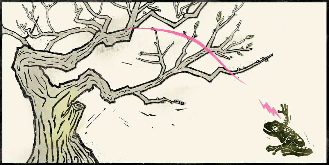 弱小的小闪电坠入世间,正好掉到了青蛙的头上,唤醒了冬眠的它。