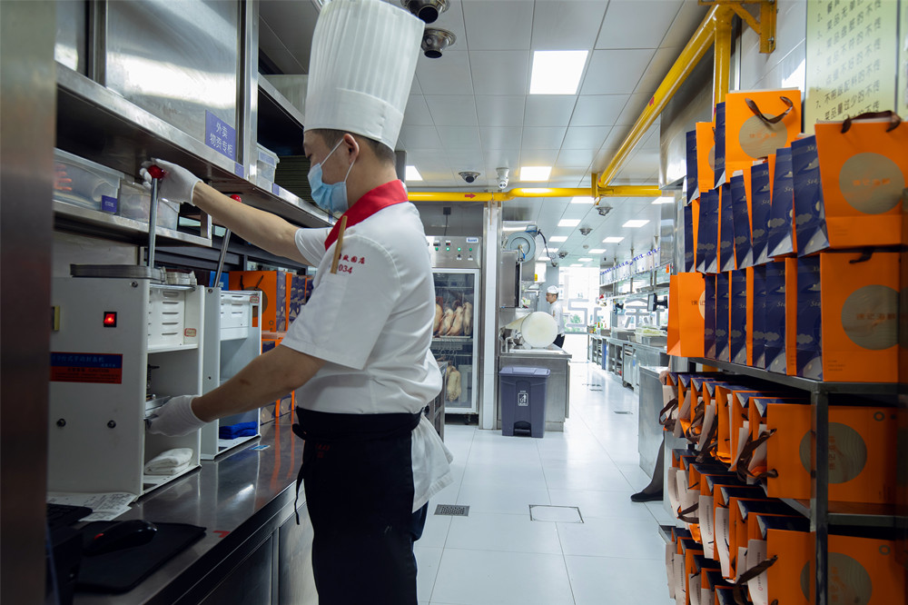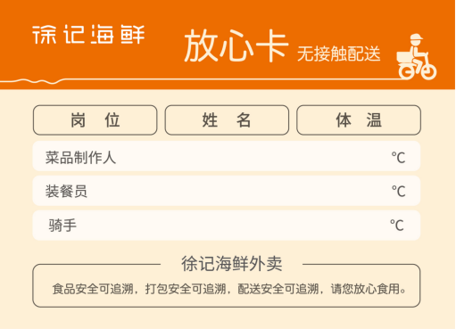 此外,门店还推出堂食外卖人员分流措施:在门店设立外卖取餐处,引导取餐人员分开有序取餐,严防送餐人员、消费者聚集交叉。在此基础上,徐记海鲜还推出全程“零接触配送”服务。不仅要求配送人员在取餐时量体温、手部酒精消毒,还增加了外卖包装外罩,并对外卖食品盛放容器或者包装进行封签,即可避免汤汁洒落,又可防范交叉感染。而且,徐记海鲜的每个外卖订单均会生成安心卡,标注生产、配膳等相关人员健康信息,做到有迹可循,确保配送期间的食品安全。