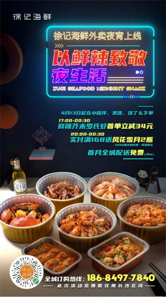 夜宵在哪点?每日17时到凌晨零点30分,用户在徐记海鲜外卖小程序、饿了么、美团外卖选择万象汇、市府店、伍家岭店、德政园店、万国城店、新时空店、红星店、沙湾店、阳光100店、梅溪湖店10家门店,便可享受3公里内用户下单首月全城消费者免费配送、订单满168元还送两瓶啤酒、招牌鲜辣芥末罗氏虾8折回馈等多重优惠。