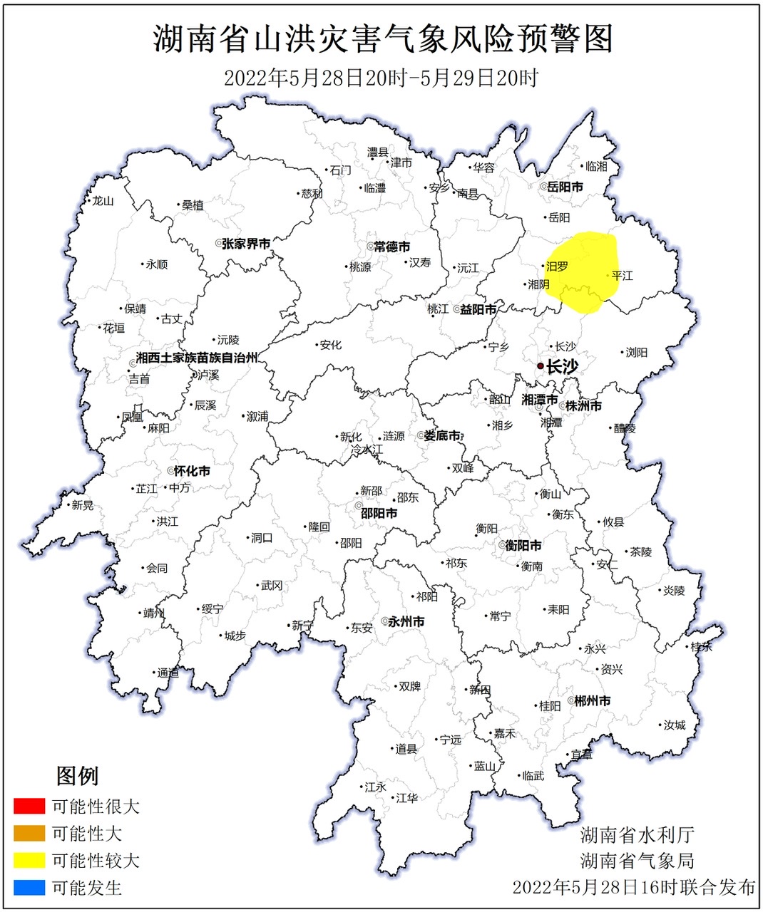 长沙晚报掌上长沙5月28日讯(全媒体记者 刘琦 通讯员 罗璐)记者刚刚从省水利厅获悉,根据省气象台5月28日短期气象预报情况,省水利厅与省气象局联合会商得出如下结论:自5月28日20时至29日20时,受降雨影响,岳阳市中南部、长沙市北部等局地发生山洪灾害的可能性较大(黄色预警)。