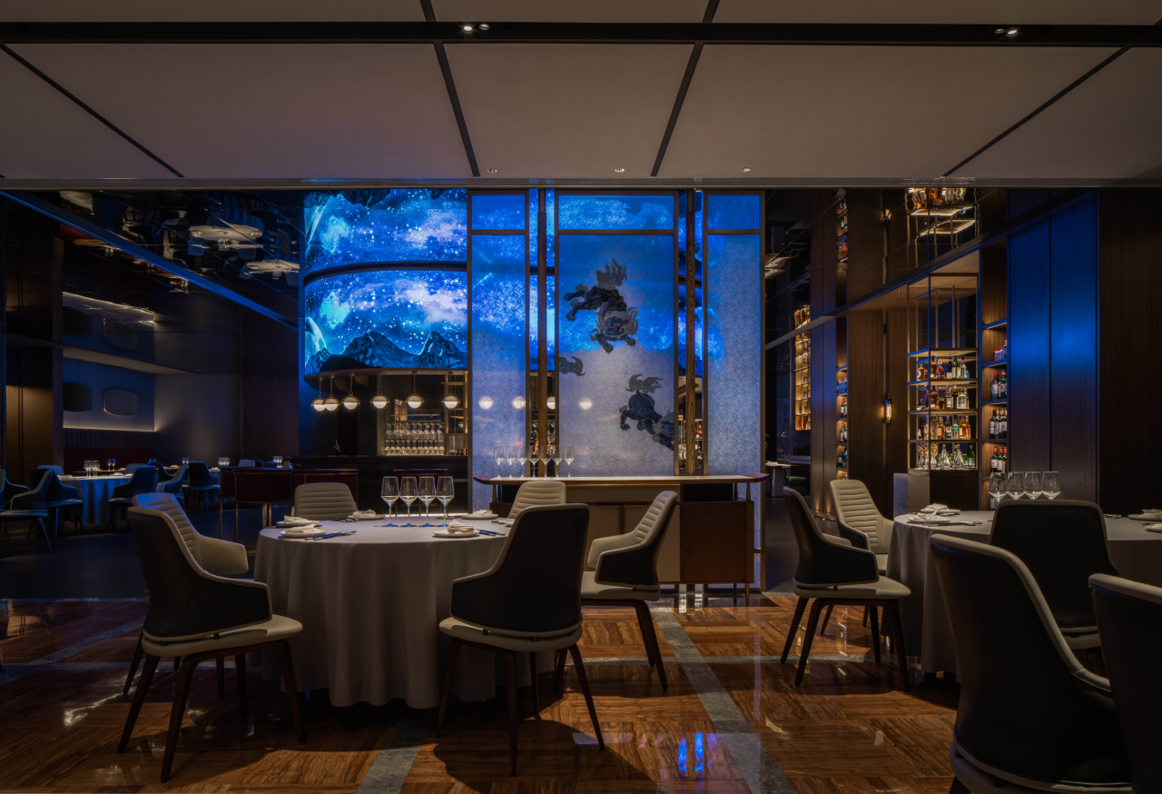 置身其中,犹如在深海中用餐。整个餐厅以“海洋”为灵感,采用流光金与静谧蓝打造高奢用餐环境;顶部巨型led曲面屏的光线浸染四周,光影浮沉,营造出全沉浸式视觉艺术餐饮体验。在空间设计上,不仅“出圈”国内设计界,还曾登上希腊《ktirio》杂志。