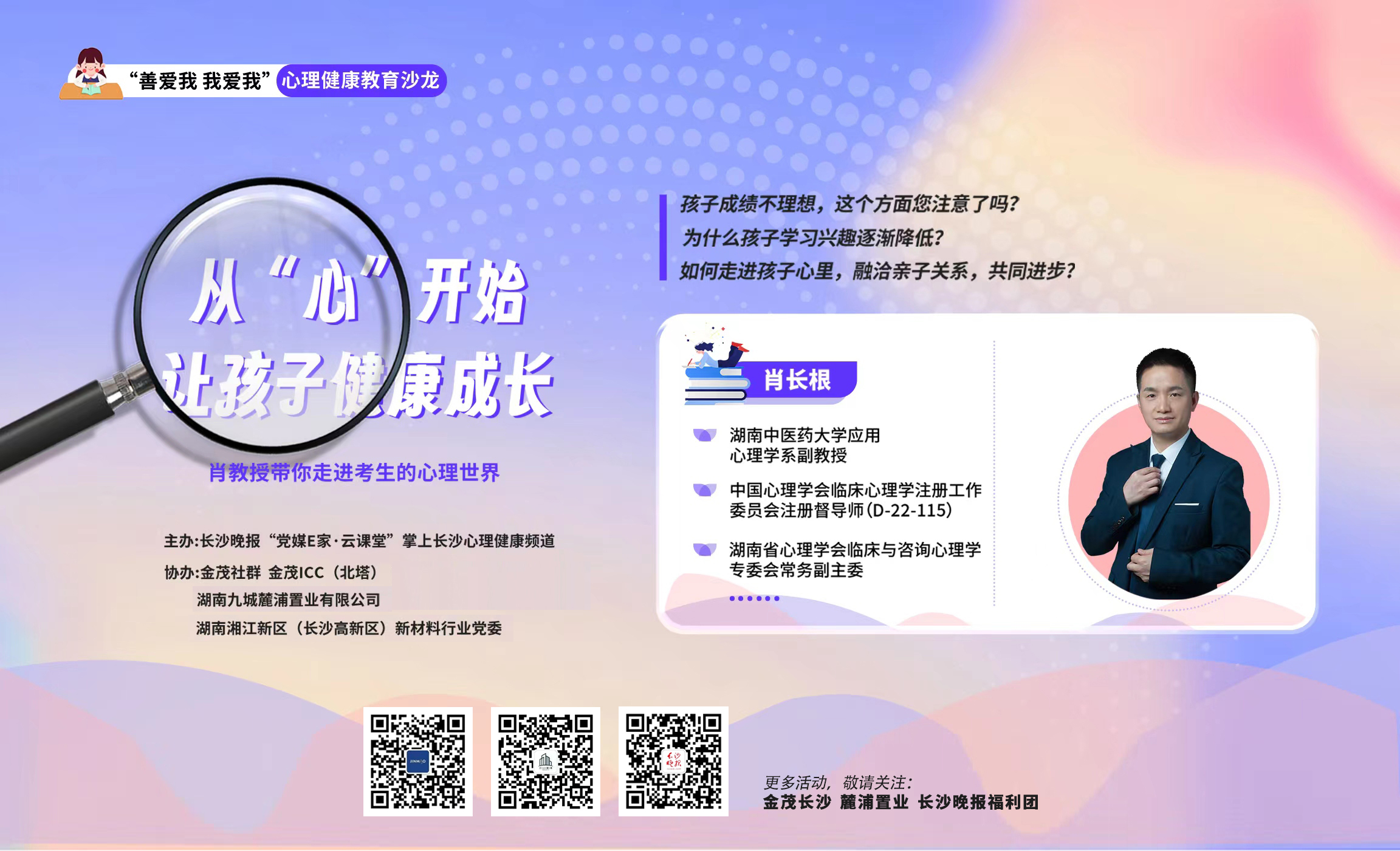 长沙晚报“党媒e家·云课堂”、掌上长沙心理健康频道将继续开展心理健康教育活动,满足学生健康成长的需要,推进素质教育的进程。错过现场参加活动的家长,可关注“长沙晚报福利团”微信公众号(“csfl0731”)观看往期心理健康课程视频回放。