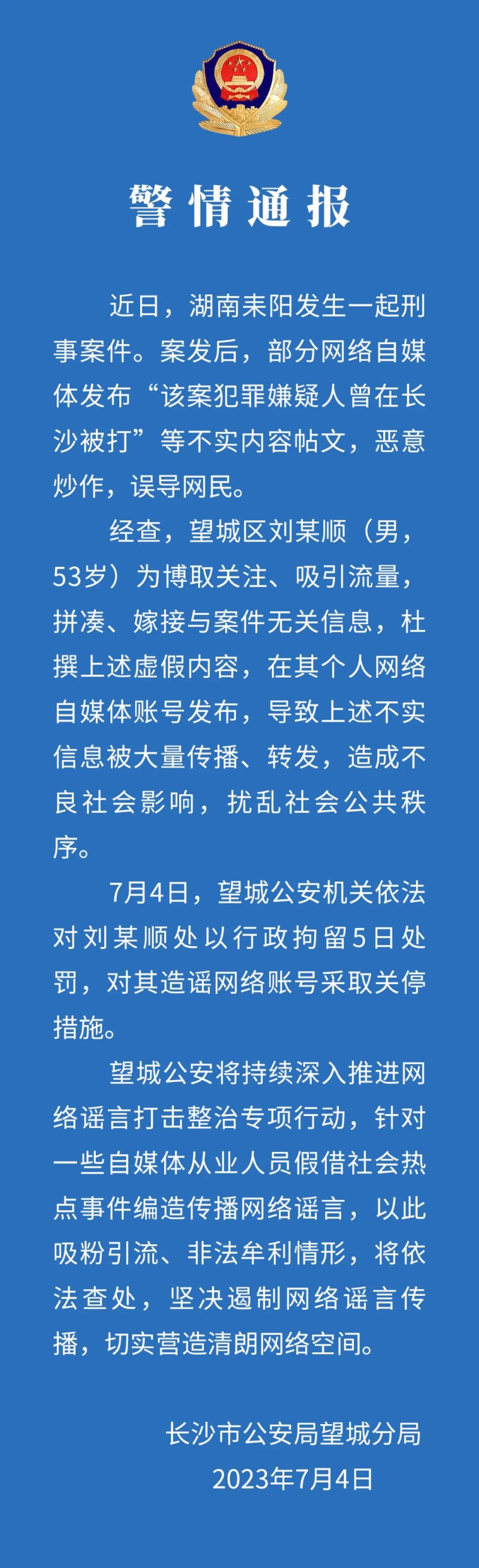 7月4日,望城公安机关依法对刘某顺处以行政拘留5日的处罚,对其造谣网络账号采取关停措施。