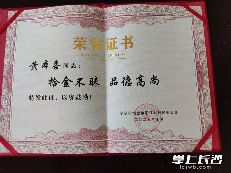 “老黄任村里的保洁员,每个月的工资才1000多元,12000元相当于他一年的工资。面对这么多的钱他不为所动,立马报告了村上,实为难能可贵。”赵建强告诉记者,村上已授予黄本喜“拾金不昧 道德高尚”九游网址的荣誉证书,并号召广大群众向他学习。