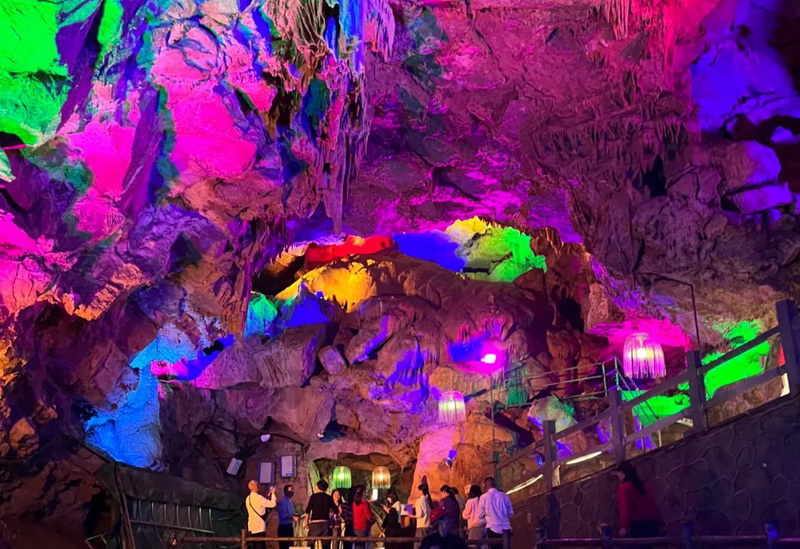 30公里外的千佛洞则是另外一番景象。常年保持18℃左右的溶洞里,钟乳石、石笋、石柱千姿百态,游客们乘船而入,洞谷幽深,迂回曲折,阴河、瀑布暗地横生,奇景迭出。