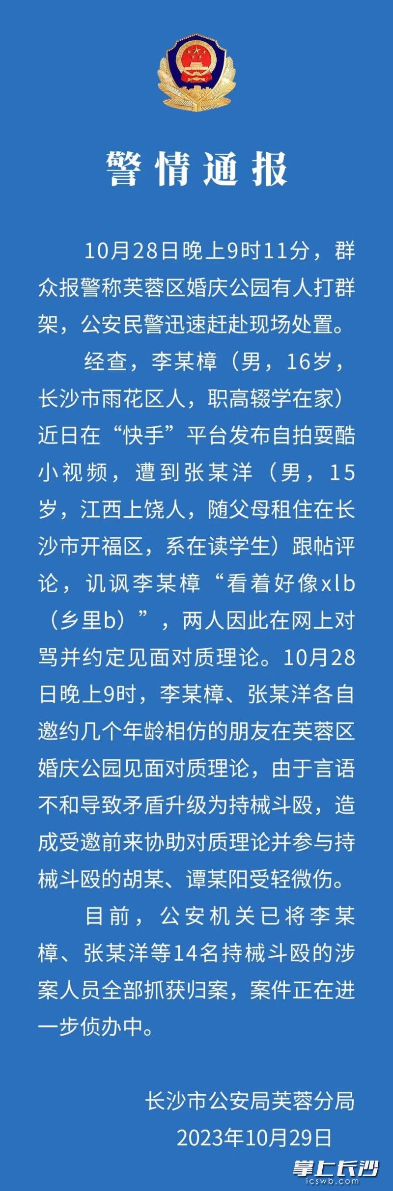 长沙晚报掌上长沙10月29日讯(全媒体记者 邓艳红)29日,芙蓉公安分局发布警情通报:10月28日晚上9时11分,群众报警称芙蓉区婚庆公园有人打群架,公安民警迅速赶赴现场处置。