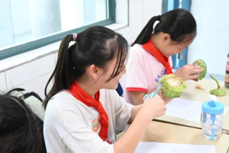 随后,课堂延伸至科学解剖莲子,认识莲叶环节,随着莲子的剥开,同学们在实践中学习莲子结构,学习莲叶“滴水不沾”的特性,寓意深刻,发人深省。紧接着,志愿者引导同学们诵读并赏析历代咏莲名篇,这些经典诗文不仅展现了莲花的自然之美,更表达了古人对于清廉高洁人格的追求与向往,让同学们在文学的浸润中提升了对廉洁文化的理解与认同。