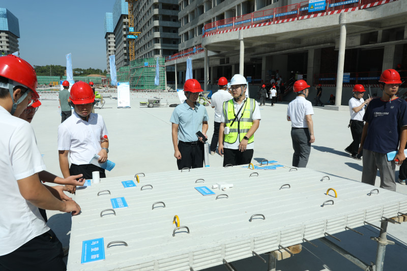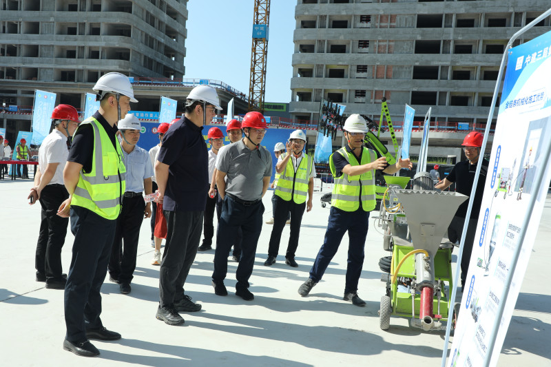 观摩会围绕智能建造新质生产力主题,以“实体展示+现场讲解”的形式,展示了项目智能建造与质量安全标准化成效与亮点,着重对项目智慧工程智慧中心、智能无人值守施工电梯、智能玻璃安装机器人、bim数字孪生系统以及机喷轻质砂浆、保温叠合板、三明治墙体等新材料、新技术展示交流,分享项目标准化、工业化、数字化、智能化、绿色化“五化一体 同步推进”的建造理念。