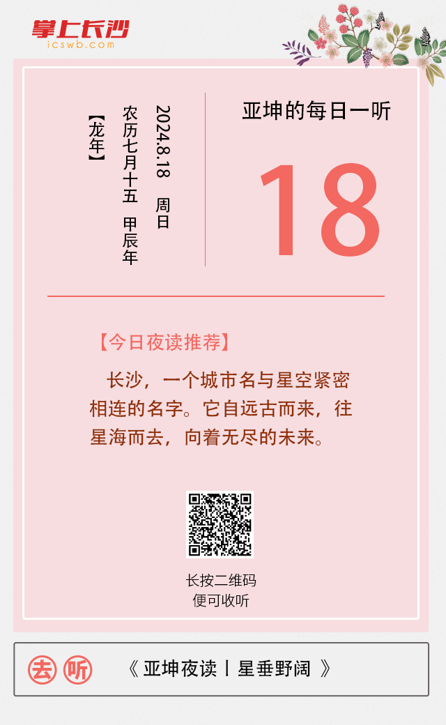 长沙又号星城,抬头望去,微风簇浪,满天星河,亿万颗恒星跨越数不清的光年,倒映出紫蓝色的浩瀚星宇。古人用自己的智慧了解星空,解释他们是什么,又联想自己是什么,给予了自己一个名字——长沙,一个城市名与星空紧密相连的名字。它自远古而来,往星海而去,向着无尽的未来。