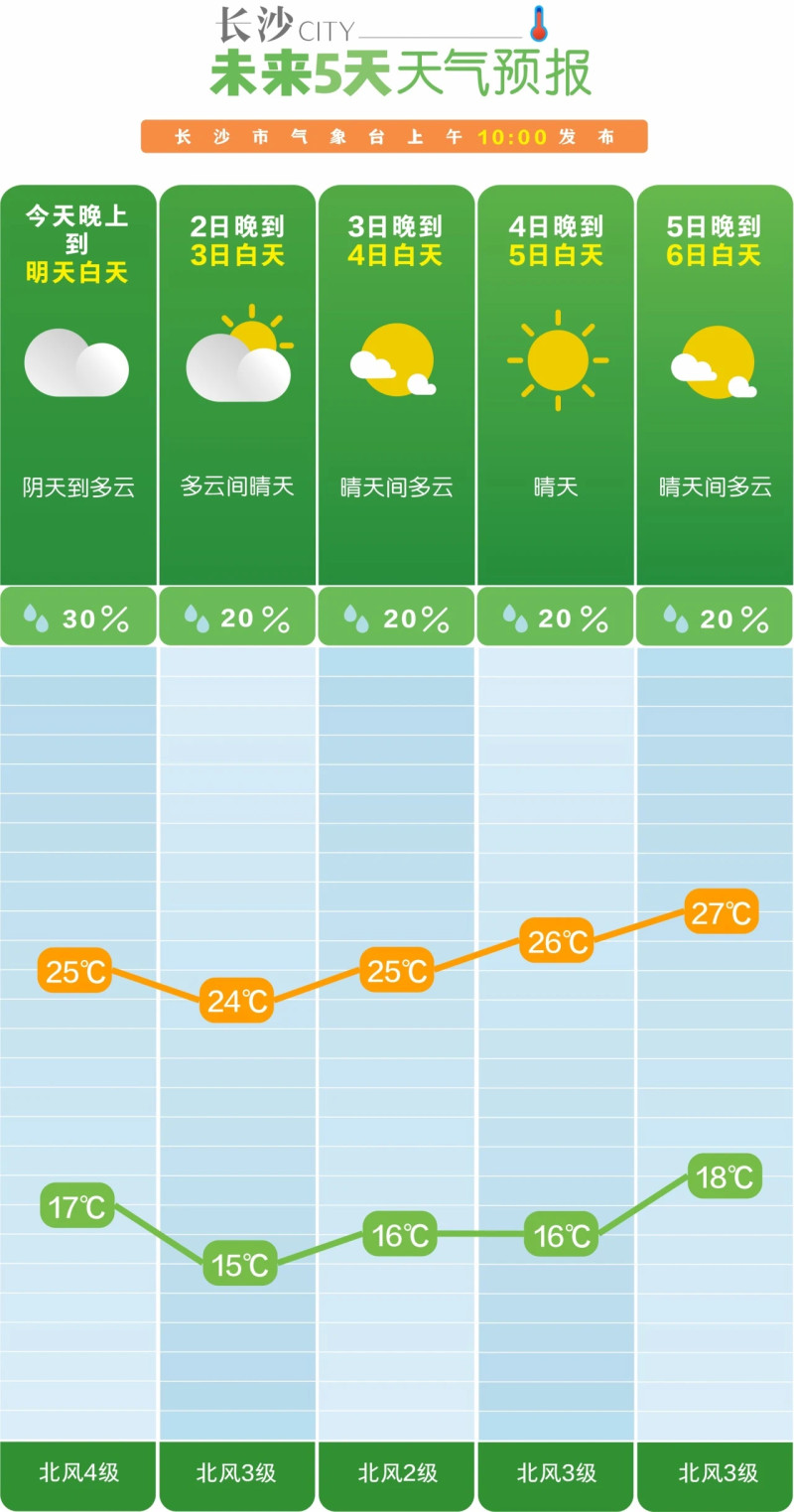 接下来,凉感明显将是常态。记者从长沙市气象台了解到,预计1日晚到2日,长沙阴天到多云,气温17℃至25℃;2日到6日,高空偏北气流控制,长沙晴天或多云;7日到8日弱冷空气渗透,将伴有弱降水。