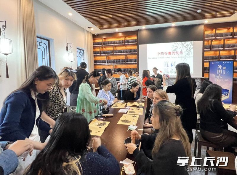 在讲解员的引领下,留学生们逐一参观了长沙人文馆、视障文献借阅室以及多元文化馆等独具特色的阅览空间。在多元文化馆里,留学生们热情地介绍了自己家乡图书馆的情况,来自俄罗斯的瑞娅对长沙图书馆宽敞明亮的阅读环境、丰富多彩的馆藏资源以及先进的智能阅读设备惊叹不已。在简书房中,他们一同学习井穴保健操、辨识中药材、制作中药香囊,还亲身体验了针灸,纷纷赞叹中医药文化的神奇。