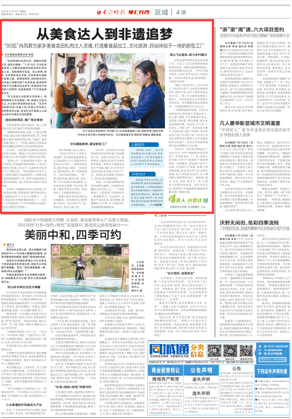 “2023年,我们营业额超过了1000万元,今年产销两旺更会有惊喜!”肖凤君表示,下一步,龙田扎肉非遗工坊生产基地和产值矩阵将进一步规模化,联动农产品生产基地、中药材生产基地、花猪土鸡养殖基地,形成龙田首个生态观光基地,加上四知桥文化村、瓦子寨郊野公园等特色景点,集体验、研学、生态、美食、观光于一体,让更多人知道龙田美食,品尝龙田扎肉,进而将宁乡地域特色健康食材推向更广阔的市场。