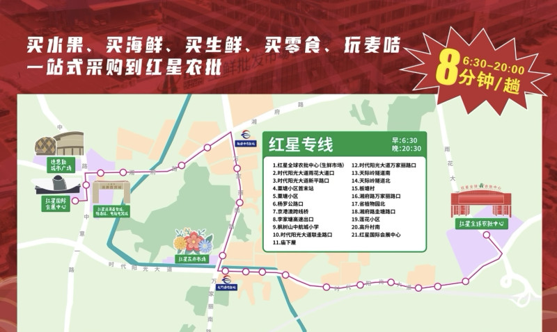 据了解,红星专线巴士将往返于新、老红星市场,为市民提供便捷服务。发车时间是每天6:30至20:30,间隔8分/趟,途经红星国际会展中心、红星糖酒批发市场、德思勤城市广场、红星全球农批中心水果批发市场等地,全线设20余个站点。同时,红星巴士专线在长沙地铁5号线毛竹塘站实现无缝接驳换乘,方便市民换乘出行。