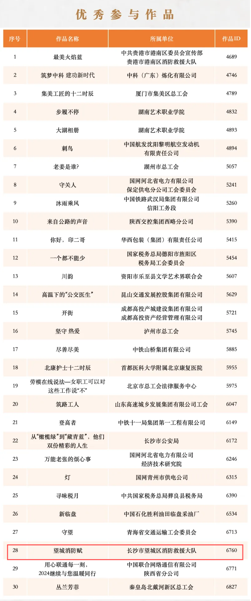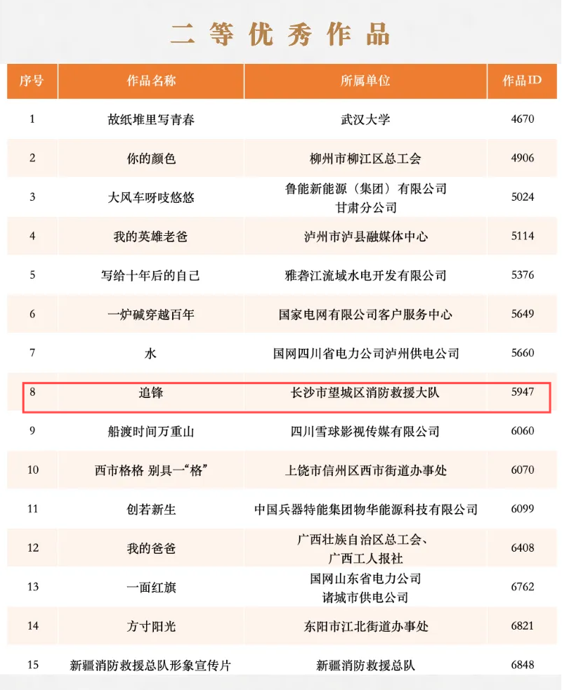 长沙晚报掌上长沙1月1日讯(通讯员 汤淑)2024年12月31日,由全国总工会、中央网信办主办的2024年“网聚职工正能量 争做中国好网民”全国正能量微视频征集活动评选结果揭晓,长沙市望城区消防救援大队微视频《追锋》被评为二等优秀作品,《望城消防赋》被评为优秀参与作品。