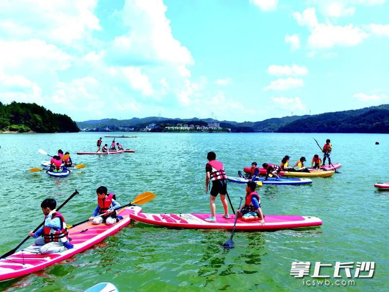 6月11日,细雨笼罩着沙市镇长春村,赤马湖上薄雾氤氲。摩托艇、脚踏船整齐排列在湖面上,浏阳市弧动滑水俱乐部的墙上悬挂着救生衣、桨板。“虽然今天下雨,但仍有十几个客户预约了下午体验滑水项目。”俱乐部负责人袁金亮介绍。