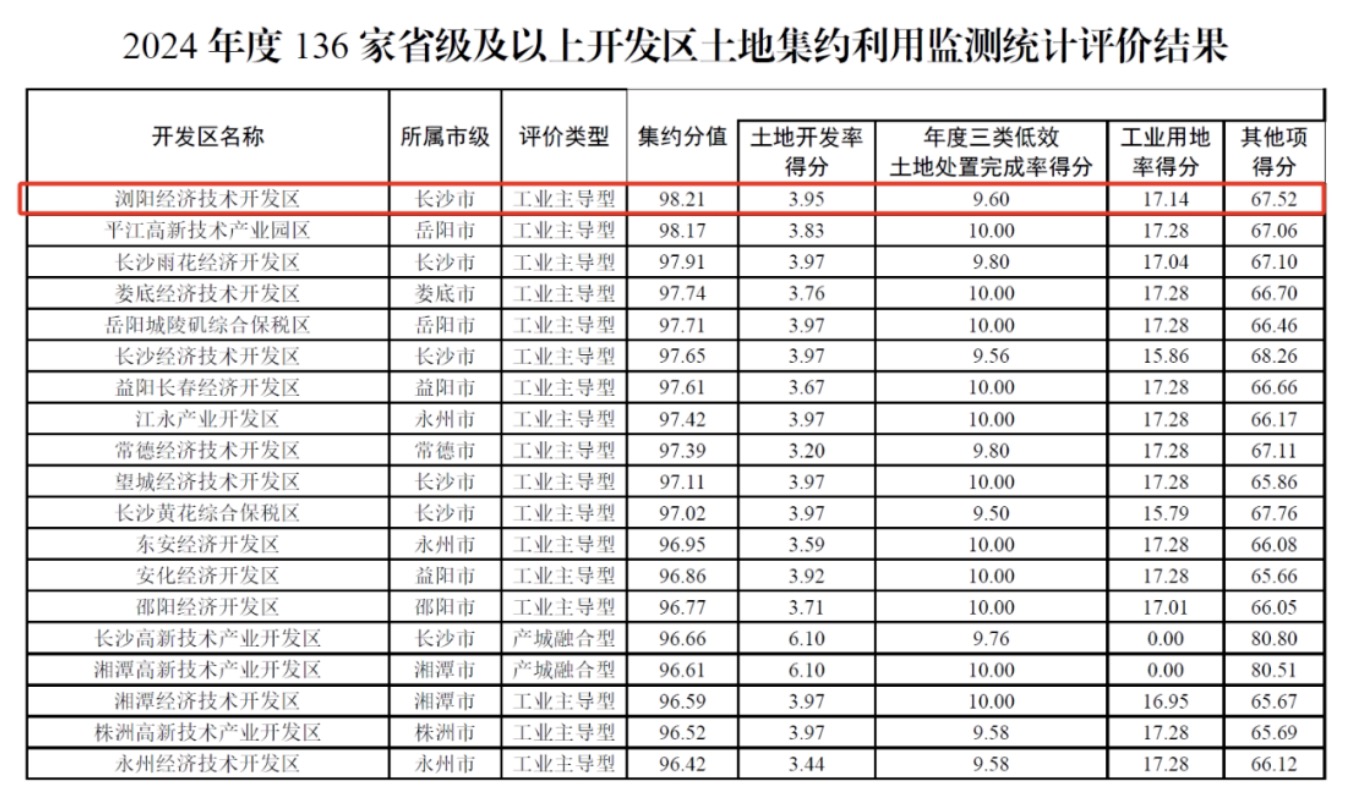 6月11日,湖南省自然资源厅办公室发布《关于湖南省2024年度开发区土地集约利用监测统计情况的函》,正式公布了2024年度136家省级及以上开发区土地集约利用监测统计评价结果,其中,在工业主导型开发区中,浏阳经开区以98.21的集约分值,再次位列第一,持续领跑全省省级开发区。