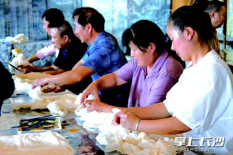实际上,这种合作共赢已经有了具体的实践。“去年6月我们第一次举行‘行走的非遗课堂’后,就有许多非遗代表性传承人碰撞出火花。”市非物质文化遗产保护中心副主任欧阳继勇举例——夏布与菊花石融合,做出了菊花石夏布挂件香包;古山贡纸与小河木活字印刷在道官冲民宿联袂展示,游客可现场体验从古法造纸到木活字印刷的完整工艺流程;蒸解放每周五推出皮影戏专场演出,食客在品尝浏阳蒸菜的同时,还能观看非遗代表性传承人带来的《三打白骨精》等经典剧目。
