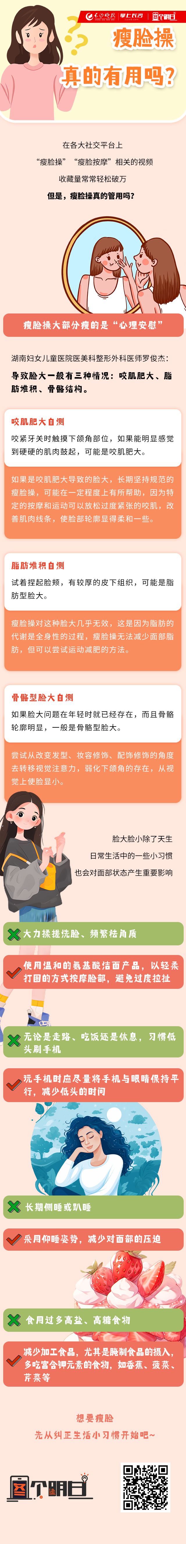 科学大求真丨瘦脸操,真的有用吗?-九游网址 稿源:掌上长沙2025-07-08 16:34 相链区块链 您的浏览器不支持 audio 标签。 嘟嘴、鼓腮帮、舌头在口腔内转圈……在各大社交平台上,但凡出现带有 “瘦脸操”“瘦脸按摩”等关键词的视频,往往会吸引众多网友跟帖与评论,收藏量常常轻松破万。但是,瘦脸操真的管用吗?作者:肖娟 王聘编辑:曾茜 【作者:肖娟 王聘 曾茜】 【编辑:肖娟】 长沙晚报社九游网址的版权声明 关键词: >>我要举报