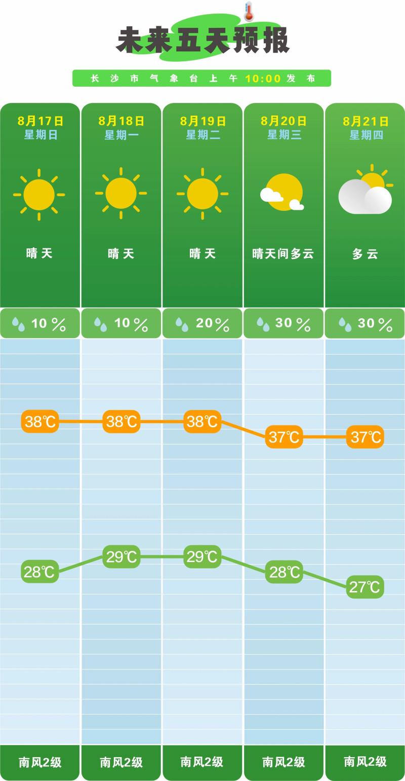 据长沙市气象台预计,16日到21日,副高牢牢控场,长沙天天都是大晴天或多云,大太阳全程“在岗”,白天最高温基本维持在37℃至38℃,其中17日长沙晴天,28℃至38℃。不过,22日到23日长沙天气会“变脸”,多云有阵雨或雷阵雨,降水概率也会从目前的10%飙升到70%,但最高温还在36℃至37℃左右。