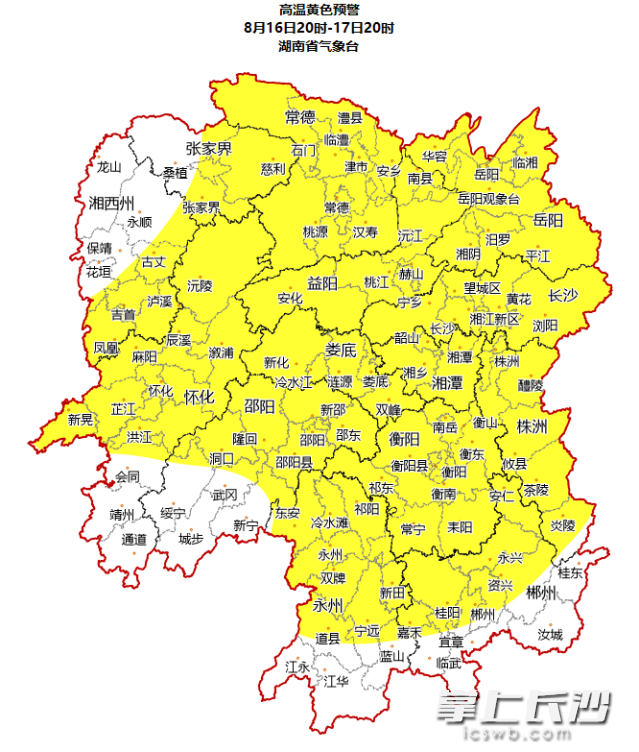 湖南省气象台今日16时继续发布高温黄色预警,预计17日白天,长沙、株洲、湘潭、衡阳、邵阳、岳阳、常德、张家界、益阳、郴州、永州、怀化、娄底、湘西州南部将达到35℃以上高温,局部地区将达37℃以上。