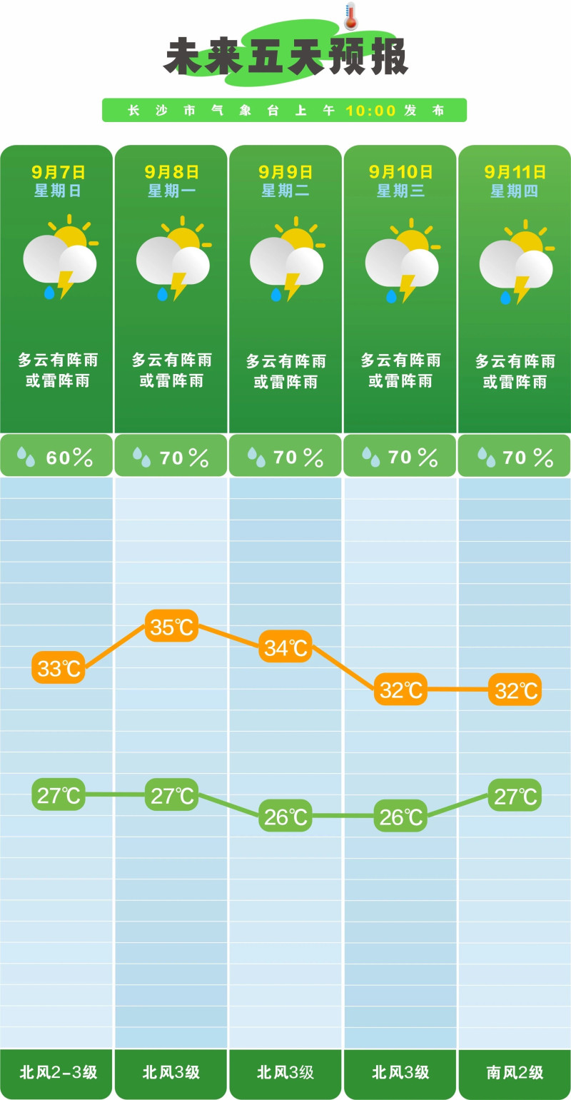 具体来看, 7日长沙多云有阵雨或雷阵雨,降水概率60%,气温27℃至33℃;8日依旧有阵雨或雷阵雨来袭,降水概率70%,气温27℃至35℃;9日,雷阵雨持续“在线”,气温26℃至34℃;10日到11日,多云有阵雨或雷阵雨,最高气温继续下降至32℃。