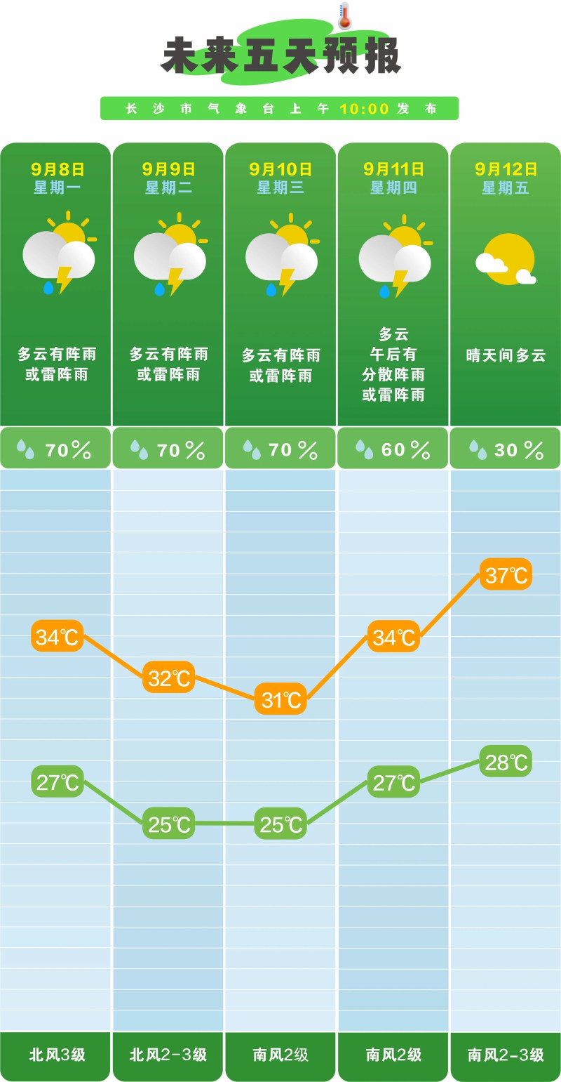 据市气象台预计,8日到10日长沙都是“多云 阵雨或雷阵雨”套餐,雨伞必备,湿度略高,体感稍闷,最高气温维持在31℃至34℃之间;11日多云为主,午后仍有分散阵雨或雷阵雨“突袭”,最高气温34℃;12日,长沙晴天间多云,降水概率降至30%,高温“返场”,最高气温升至37℃。