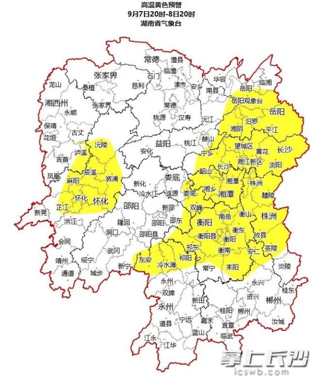 记者注意到,湖南省气象台今日16时发布高温黄色预警,预计8日白天,湘中以北部分地区有35℃以上高温,黄色预警区域包括长沙、株洲、湘潭、湘西州南部、岳阳中南部、怀化中北部、娄底东部、邵阳东部、衡阳、永州北部、郴州北部等地,其中长沙、株洲北部、湘潭、衡阳北部局部地区将达37℃以上。