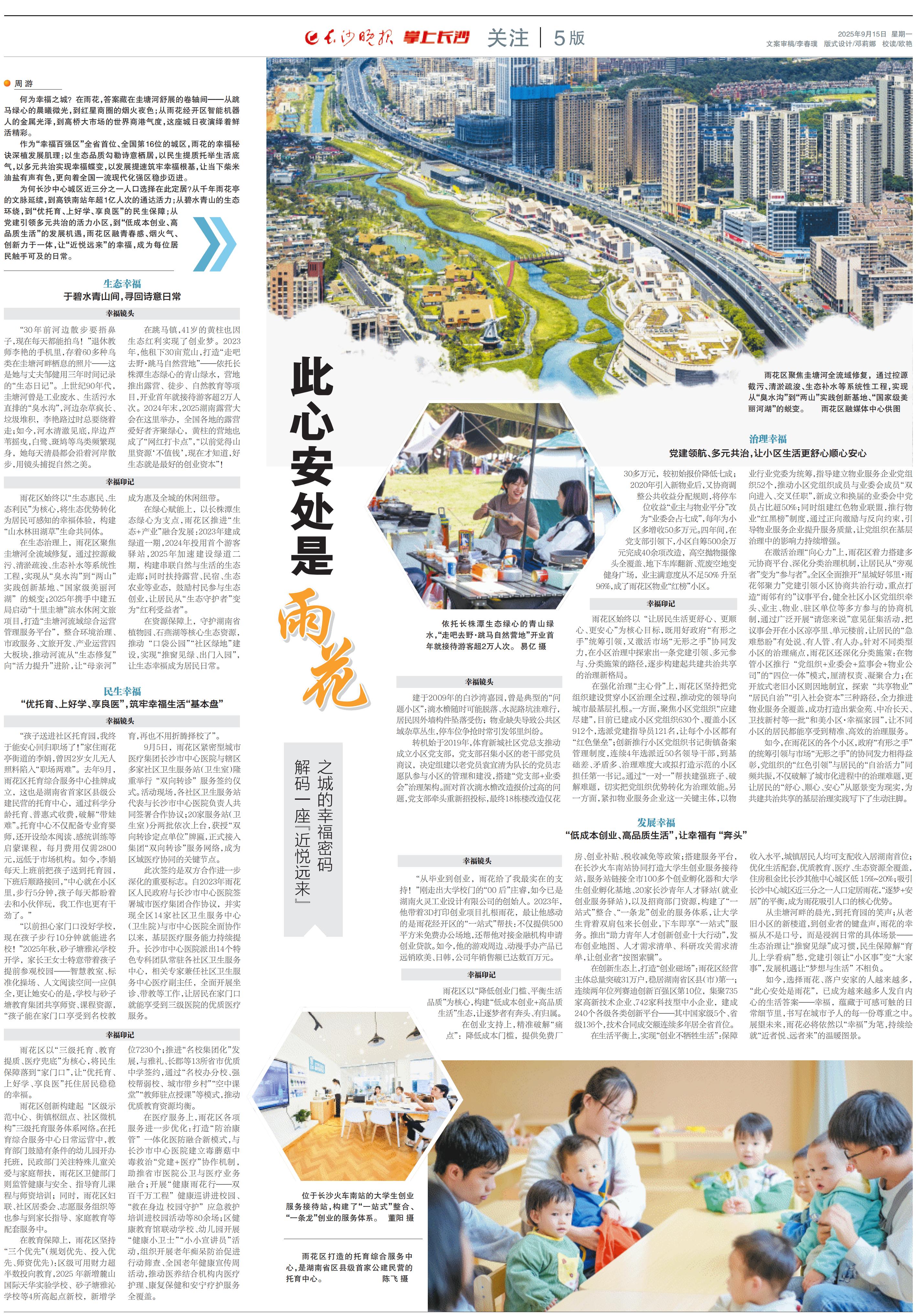 如今,选择雨花、落户安家的人越来越多,“此心安处是雨花”,已成为越来越多人发自内心的生活答案——幸福,蕴藏于可感可触的日常细节里,书写在城市予人的每一份尊重之中。展望未来,雨花必将依然以“幸福”为笔,持续绘就“近者悦、远者来”的温暖图景。