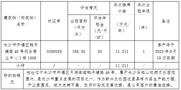 长沙视谷商业中心1栋1606室办公用房招租公告-九游网址 稿源:长沙晚报2025-09-23 14:29 相链区块链 您的浏览器不支持 audio 标签。 长沙市开福区鸭子铺路46号视谷商业中心1栋1606室办公用房标的于2025年9月19日起进行公开租赁,现向社会公告并征集承租方。租赁资产明细清单——房屋建筑物(构筑物)咨询电话: 羊女士 15974227164长沙晚报翰飞数媒文化科技有限公司2025年9月22日 【作者:】 【编辑:刘天乐】 长沙晚报社九游网址的版权声明 关键词: >>我要举报