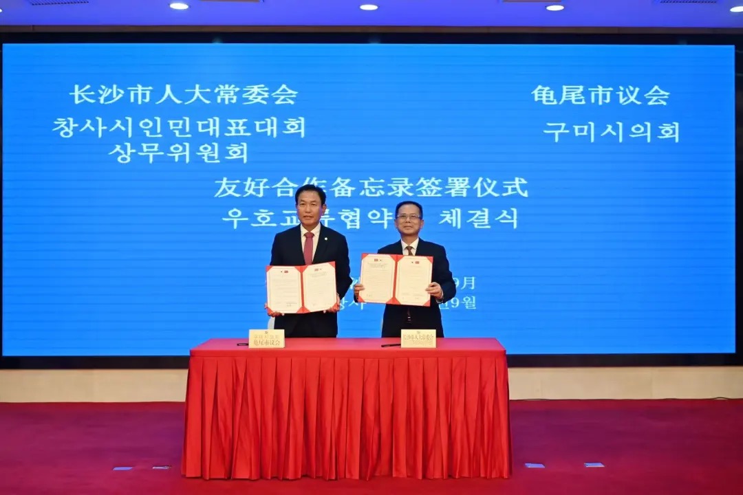 当日,市人大常委会与韩国龟尾市议会签署《中华人民共和国湖南省长沙市人大常委会与大韩民国庆尚北道龟尾市议会发展友好合作关系备忘录》,举行龟尾友城绘画作品征集活动颁奖仪式。