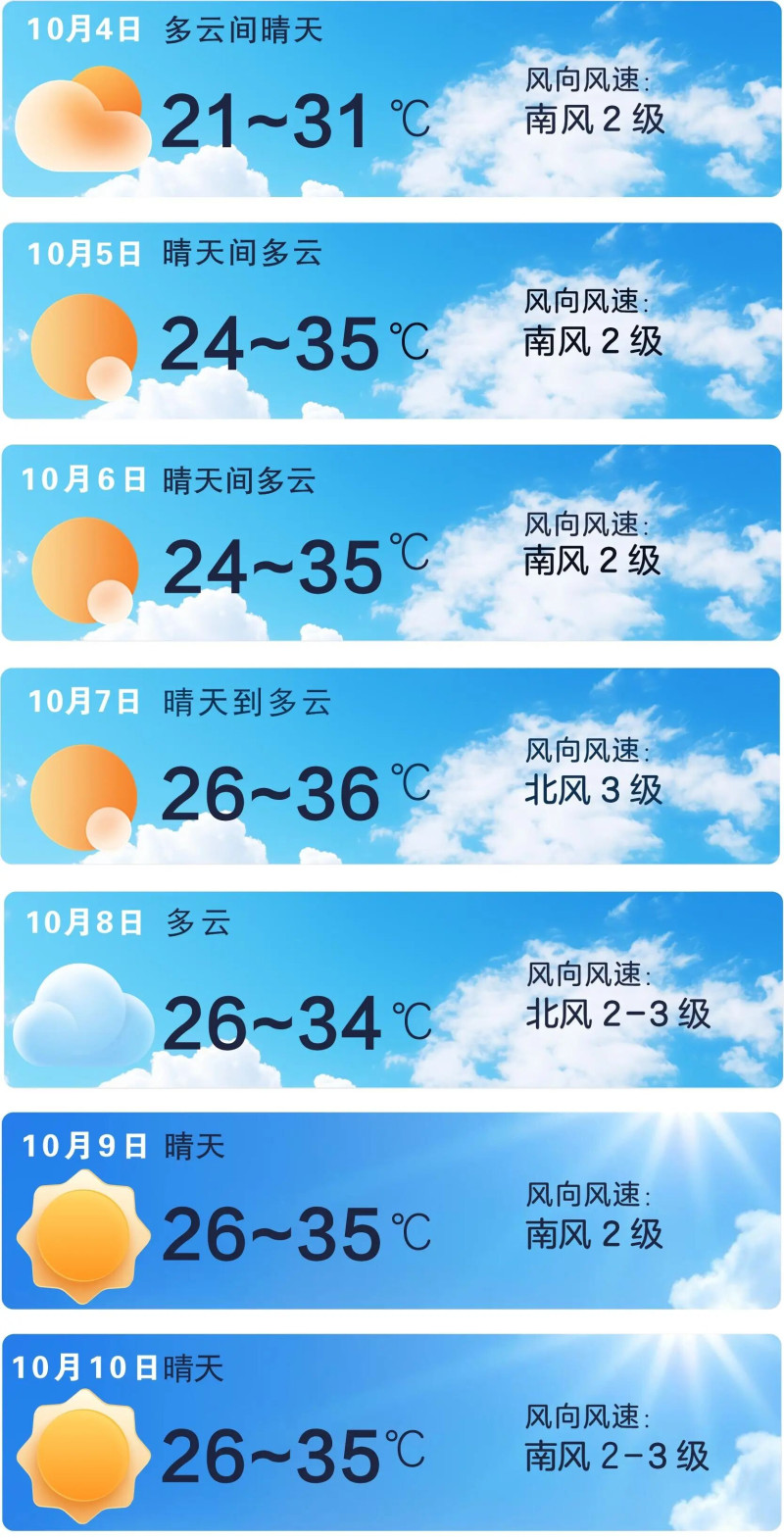 翻开这份夏日“续集”的排片表:10月4日,长沙多云间晴天,21℃至31℃,午间体感少了一些燥热,阳光也没有那么“火辣”,但整体升温的步伐并不会被打断;5日到6日直接开启“高温专场”,最高气温稳稳锁定在35℃;7日虽然北风3级“友情客串”,但36℃的“c位”雷打不动;后期返程时一直到上班日,天气也都保持在晴好的状态,8日到10日继续维持34℃至35℃的“热力输出”,夜间最低温则保持在26℃。