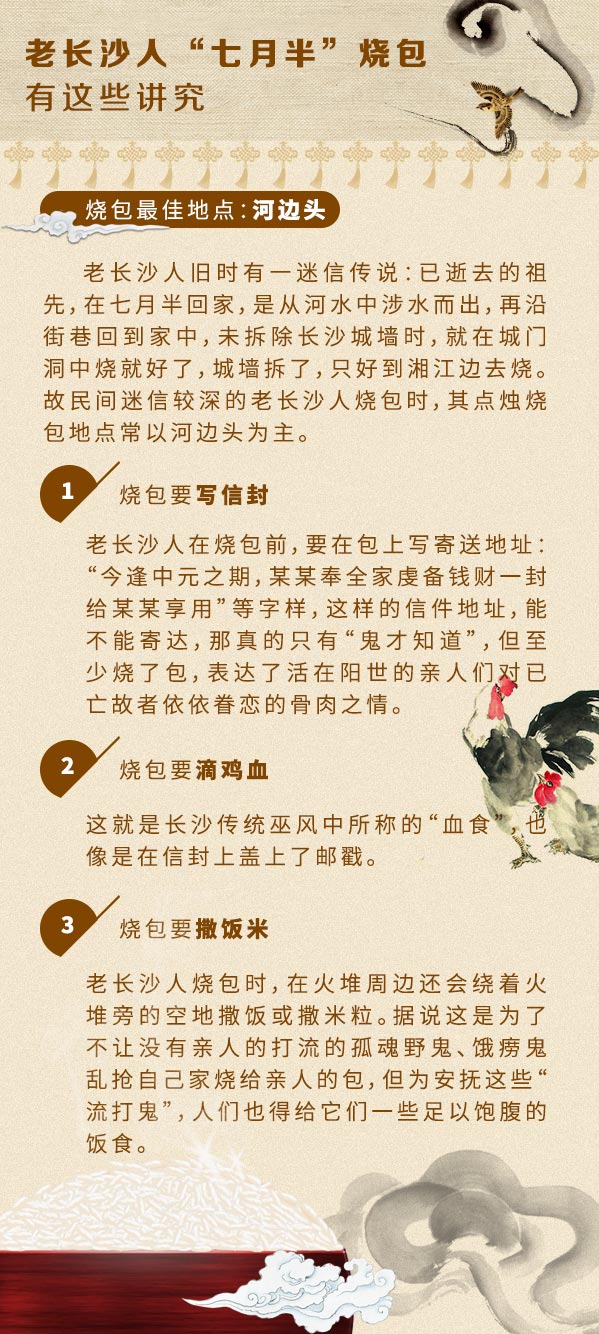 二是烧包时,必定要在午后直至子夜时分,更重要的是包上一定要滴鸡血,这就是长沙传统巫风中所称的“血食”,也像是在信封上盖上了邮戳。这样,在火光熊熊烧包之际,这些写好了信封,装好的纸钱,并盖上了邮戳的信件,便会带着后人的思念,剩下熊熊燃烧的中元火焰之马,送到另一度空间里的祖先,让他们享受衣食无忧有钱“鬼”的生活了。