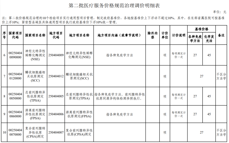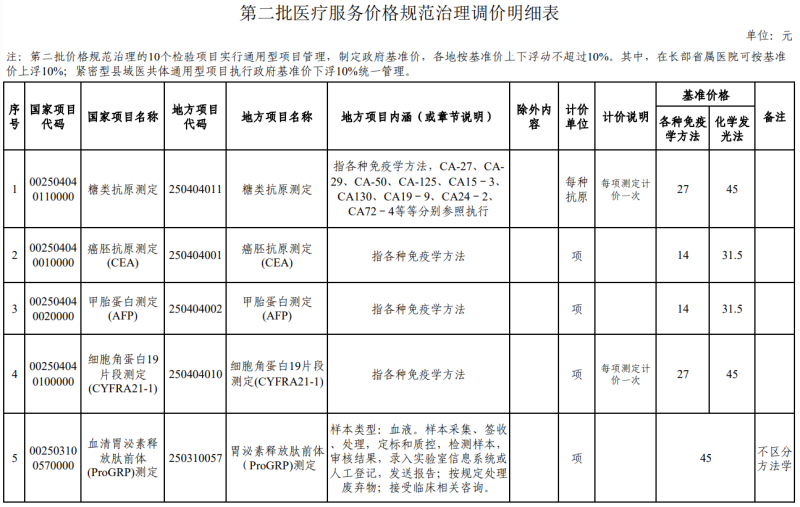 《通知》明确,下调糖类抗原测定、癌胚抗原测定(cea)、甲胎蛋白测定(afp)、细胞角蛋白19片段测定(cyfra21-1)、胃泌素释放肽前体(progrp)测定、神经元特异性烯醇化酶测定(nse)、鳞状细胞癌相关抗原测定(scc)、总前列腺特异性抗原测定(tpsa)、游离前列腺特异性抗原测定(fpsa)、复合前列腺特异性抗原(cpsa)测定10个医疗服务项目政府指导价。