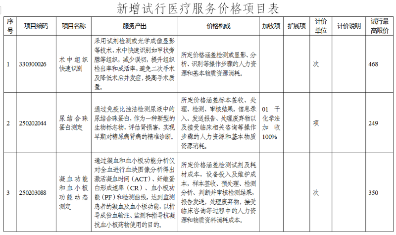 此次新增运行的医疗服务价格项目分别为:术中组织快速识别、尿结合珠蛋白测定、凝血功能和血小板功能动态测定、高尔基体蛋白73测定、氧化型低密度脂蛋白检测、vap血脂亚组分检测。