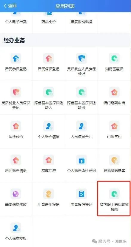 第一步:进入湘医保app,找到“经办业务”模块,点击“省内职工医保转移接续”。