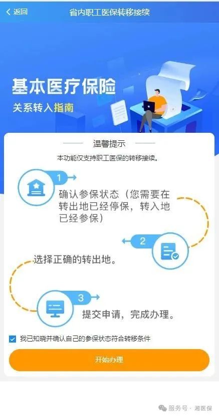 第二步:进入“省内职工医保转移接续”界面,阅读“办理指南”,然后勾选“我已知晓并确认自己的参保状态符合转移条款”,点击“开始办理”。
