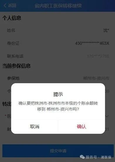 第四步:弹框提示“确认要把xx(原参保地)的个账余额转移到xx(现参保地)吗?”,点击“确认”,完成办理。原参保地将会自动计算利息,并将个人账户余额和利息即刻转入当前参保地。