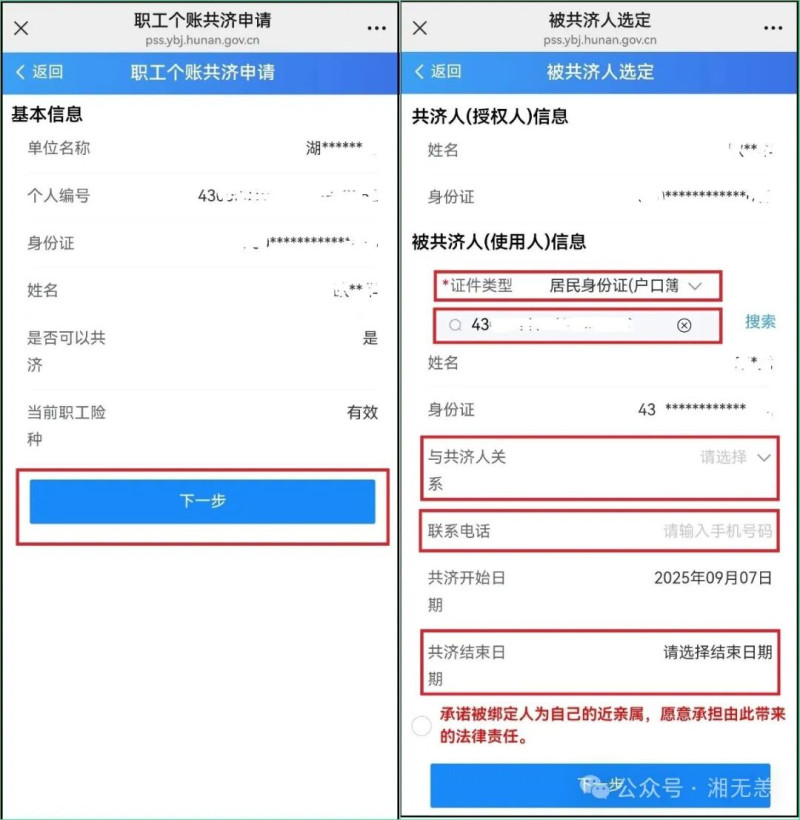 接下来,绑定共济人,如前期已绑定共济人可忽略该步骤。点击“第一步”,确认基本信息后点击“下一步”,选择证件类型,输入相应的证件号码“搜索”,然后选择“与共济人关系”“共济结束日期”,填写联系电话,填写完后点击“下一步”确认绑定。